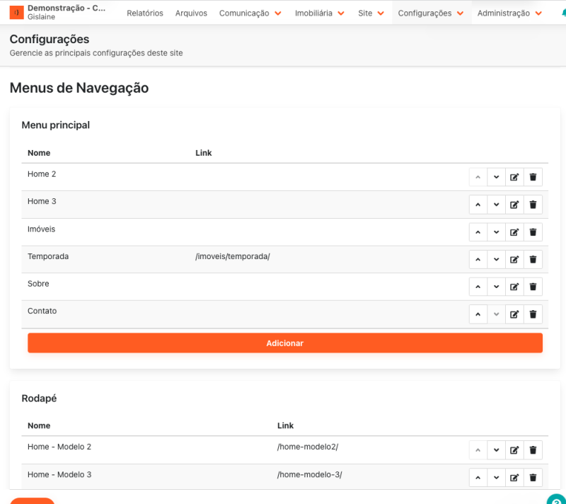 Você poderá personalizar o Menu principal, Rodapé (geral) e Rodapé - Imóveis.
