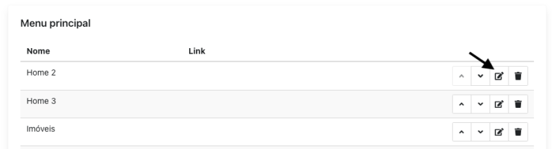 Se for necessário editar um dos itens do menu, encontre o item que deseja editar e clique no ícone de edição: