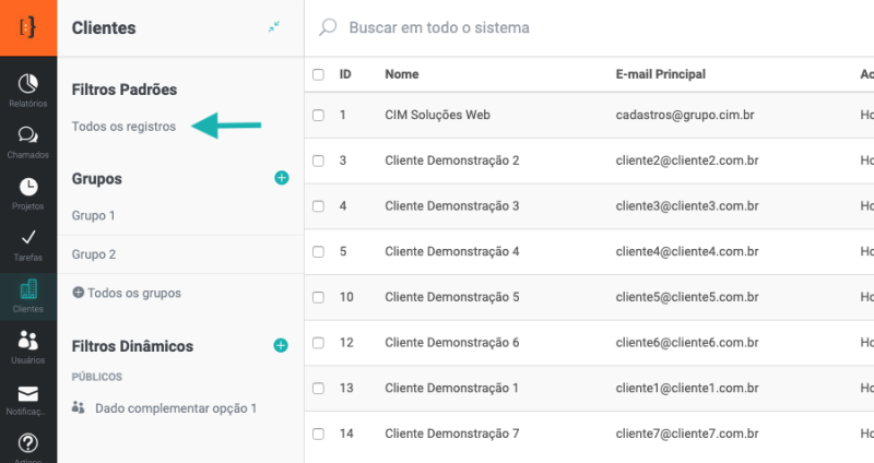 Para relacionar os clientes ao grupo cadastrado, no módulo de clientes, acesse a lista de registros.