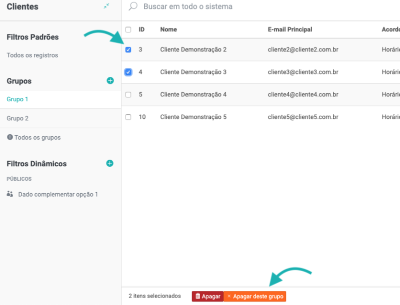 Selecione os clientes que deseja remover do grupo e clique em Apagar deste grupo. Desta forma, os cliente serão removidos do grupo.