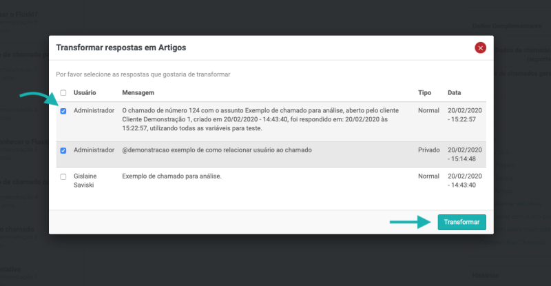 Em seguida, selecione as mensagens que deseja transformar em artigo e clique em Transformar: