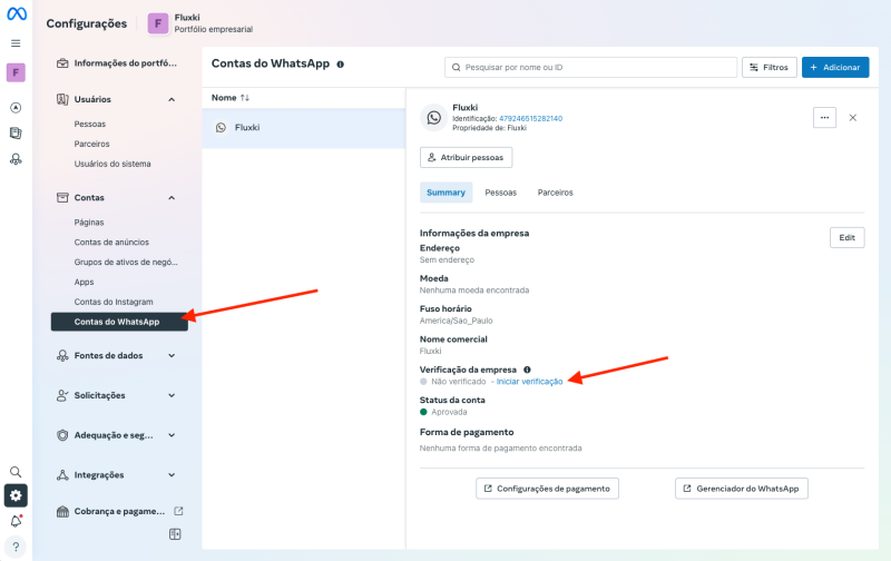 A verificação de empresa é habilitada após iniciada a etapa de configuração do WhatsApp Business API, ou seja, após adicionar o número de telefone que será utilizado para receber mensagens no Fluxki.