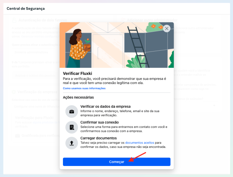 Em seguida, você será direcionado para a tela de Central de segurança da conta. No item Verificação de empresa, clique no botão para iniciar a verificação, conforme a imagem abaixo: