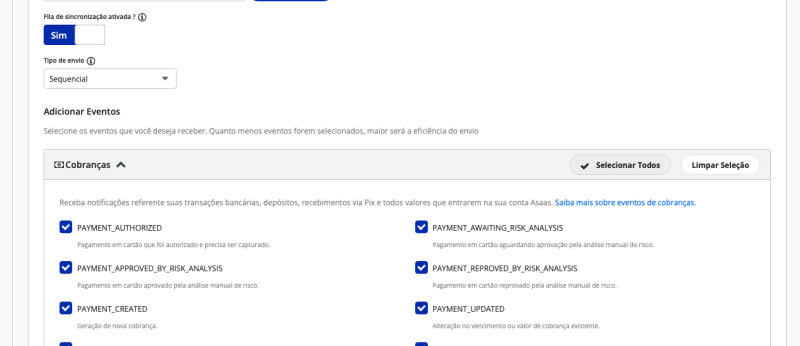 Certique-se de habilitar todos os webooks para as cobranças.