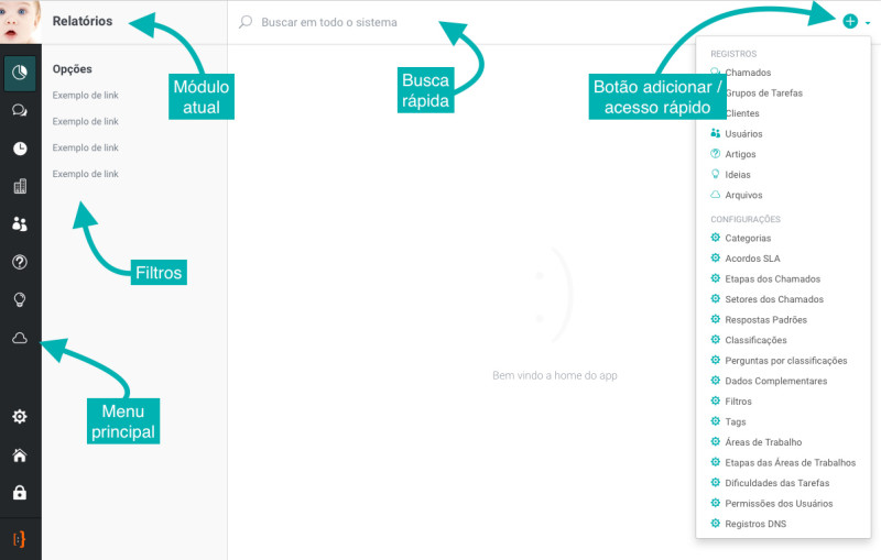 É possível navegar entre os módulos com facilidade. O menu principal, sempre ficará fixo no lado esquerdo. Além disso, você pode acessá-lo a qualquer momento.