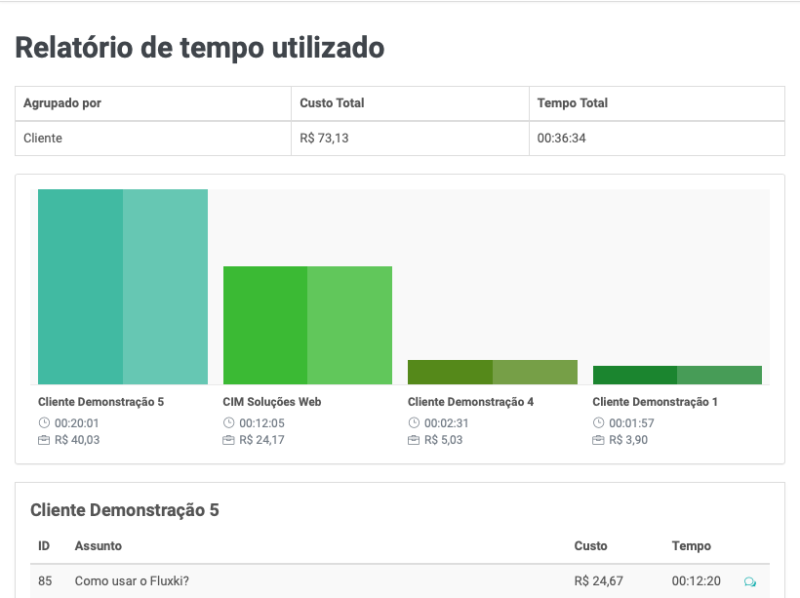 O Fluxki registra automaticamente o tempo utilizado no atendimento ao cliente, com isso, você poderá acompanhar o tempo utilizado nos chamados e acompanhar os custos envolvidos: