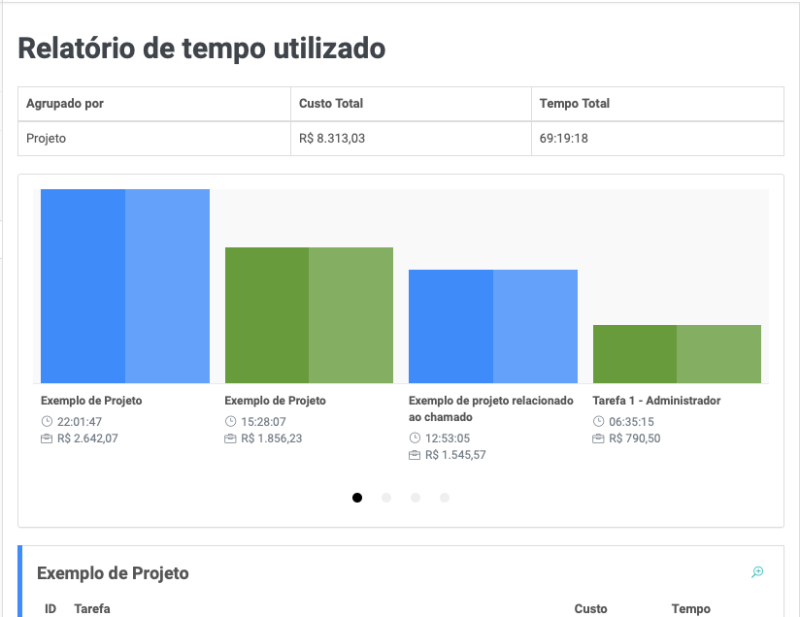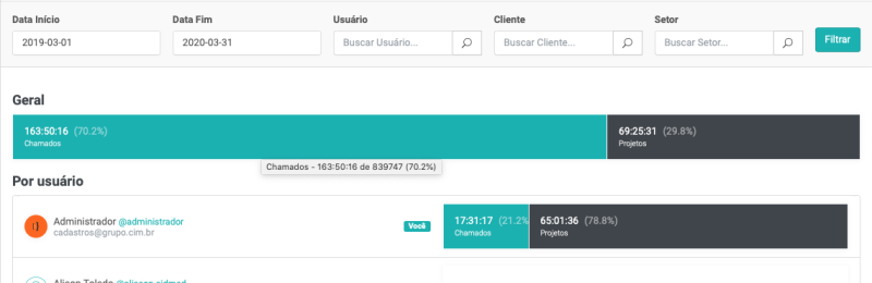 Além dos relatórios de chamados e projetos, o sistema exibe o relatório unificado, ou seja, exibe quanto tempo sua equipe trabalhou em cada módulo do sistema (chamados e projetos):