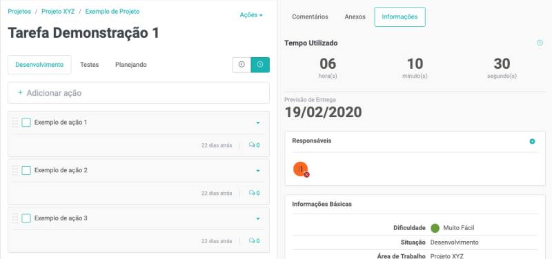 Poderá adicionar tarefas e relacionar os usuários, adicionar check-list, comentários e anexos, além do registro das horas trabalhadas em cada tarefa (separado em etapa e usuário).