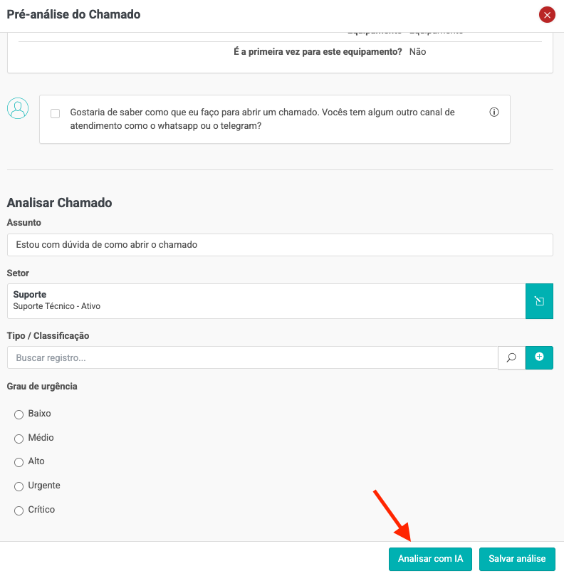 Por enquanto é necessário clicar no botão Analisar chamado com IA para gerar e salvar as sugestões nos campos do chamado.