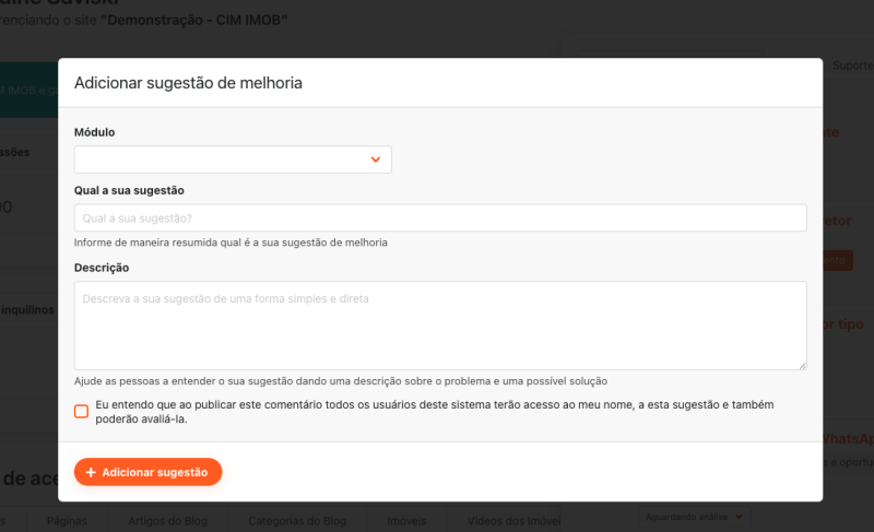 Estamos sempre buscando evoluir junto com nossos clientes — por isso, adicionamos uma nova funcionalidade ao sistema que torna você parte ativa da construção do Cim Imob: a ferramenta de sugestões com votação.