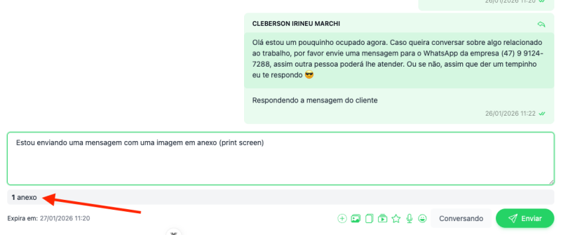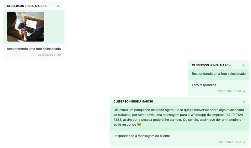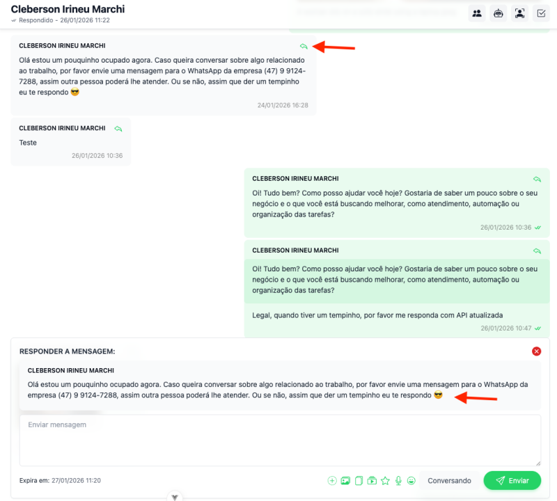É possível marcar uma mensagem do histórico como contexto para que a resposta seja enviada ao WhatsApp com a citação correta.