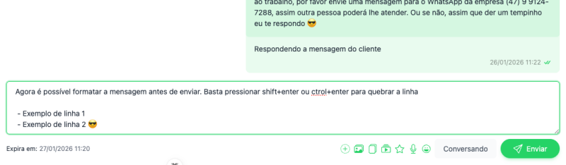 Se Ctrl ou Shift estiverem pressionados, pressionar Enter insere uma quebra de linha antes do envio.