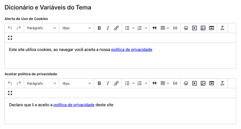 Em seguida, chegamos ao item Dicionário e variáveis do tema. Aqui você poderá personalizar: