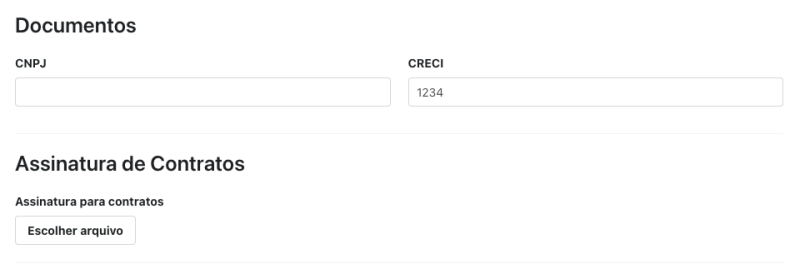 Em seguida, poderá informar o CNPJ e o número do CRECI, no item Documentos. E abaixo, poderá configurar a imagem que será utilizada como assinatura nos contratos gerados pelo sistema.