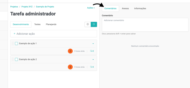 E, para adicionar comentários nas ações, clique no ícone de comentários, na ação desejada: