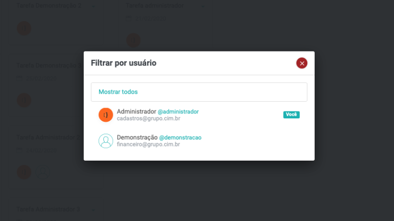 Caso seja necessário filtrar somente as suas tarefas, utilize o filtro por usuário.
