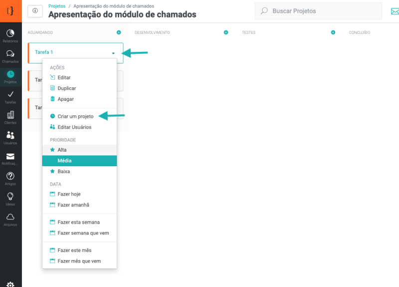 O sistema permite transformar tarefas em projetos, então, caso uma tarefa seja muito complexa, você poderá criar um projeto para ela. Para isso, na tarefa desejada (seja na área de trabalho ou detalhe do projeto), clique na seta, para ver as opções disponíveis e selecione a opção Criar projeto (imagem abaixo):