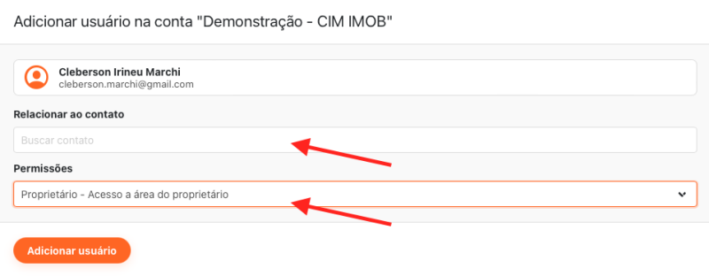 Certifique-se de relacionar o usuário com o contato do proprietário correto e selecionar as permissões de Acesso a área do proprietário