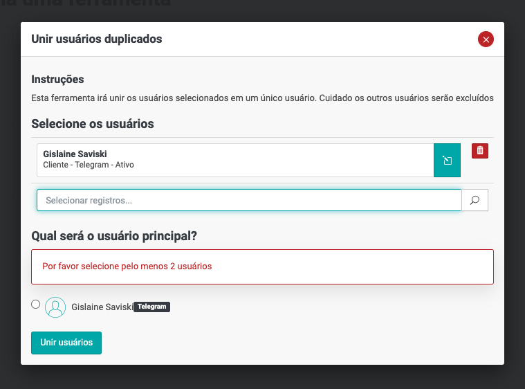 Melhoria de usabilidade da tela para escolher os usuários ou clientes que serão unificados:
