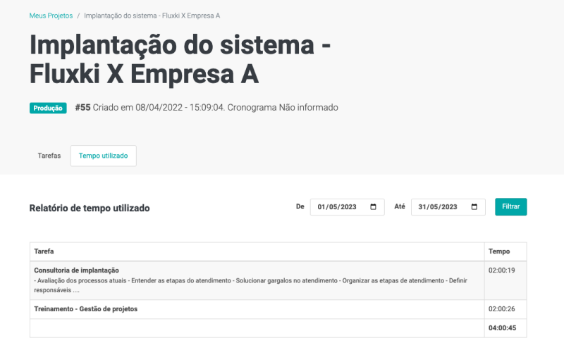 Disponibilizado na área do cliente o relatório de tempo utilizado no projeto.