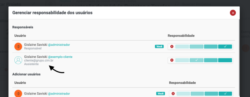 Para selecionar o usuário, encontre ele na lista e marque a permissão desejada. Os usuários relacionados serão listados em Responsáveis: