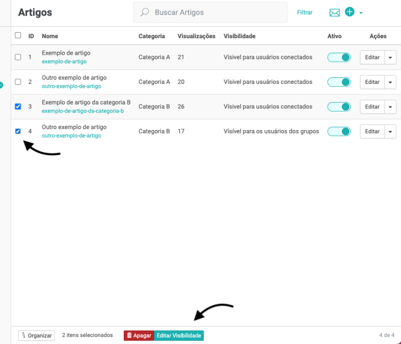 Dica: As permissões dos artigos podem ser atualizadas em lote. Na lista de artigos selecione os registros desejados e clique em Editar visibilidade: