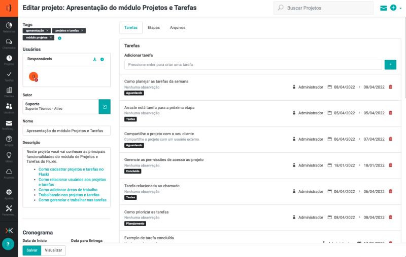 Além disso, o editor de projetos foi melhorado. Agora é exibido em tela cheia para que seja mais fácil editar os dados dos projetos, como as informações gerais, tarefas, etapa e anexos.