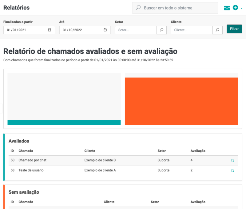 No relatório é possível visualizar o gráfico indicando o montante de chamados avaliados vs. não avaliados. Além disso, é possível visualizar a lista de chamados, agrupados pela situação da avaliação.
