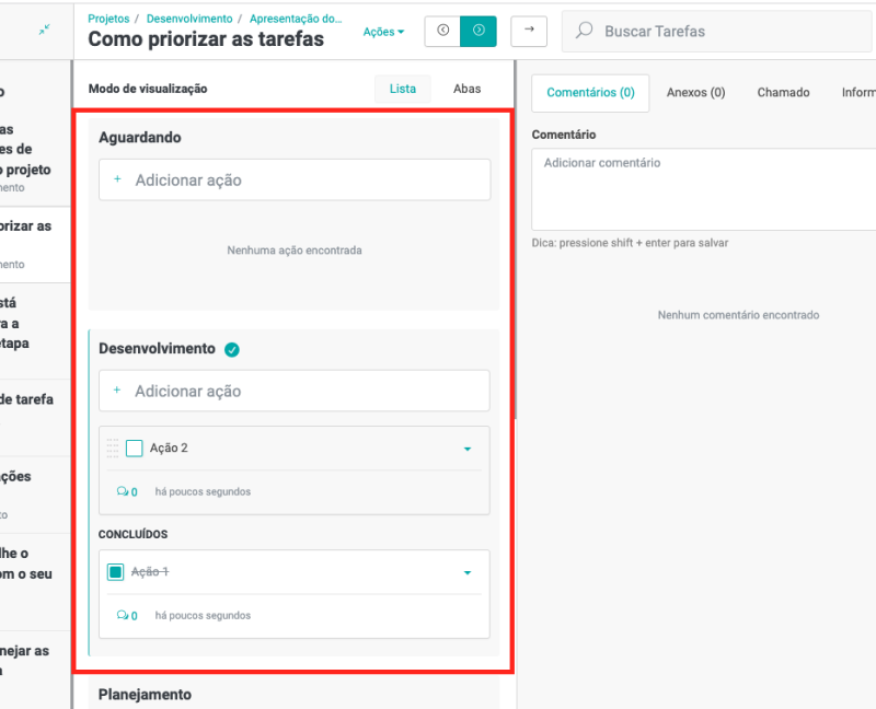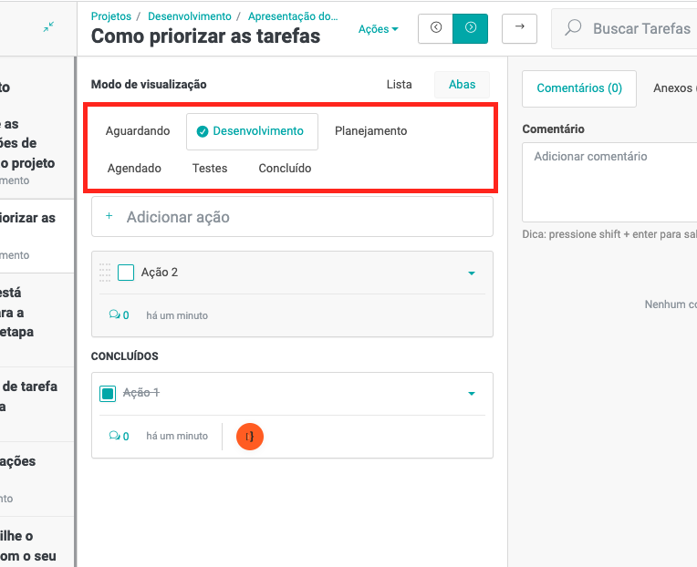 Agora é possível escolher se a visualização das ações (checklist) será em Abas ou Lista: