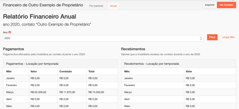 Novo relatório adicionado ao sistema, o relatório de rendimento anual. Com isso, a imobiliária poderá consultar todos os valores pagos e recebidos dos contatos financeiros.