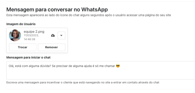Agora é possível configurar uma mensagem que é exibida ao lado do botão do WhatsApp (site), para chamar a atenção do cliente.