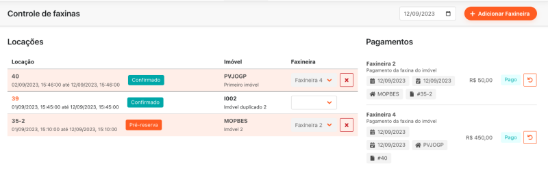 Na data de saída do inquilino do imóvel, a locação será listada e você poderá escolher o contato da faxineira que irá efetuar a limpeza do imóvel. Dessa forma, uma despesa será adicionada no sistema, para o controle dos repasses referente as faxinas.