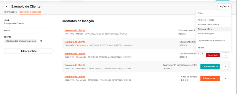 Na tela de visualização do contato é possível visualizar todos os contratos de locações relacionados à ele.